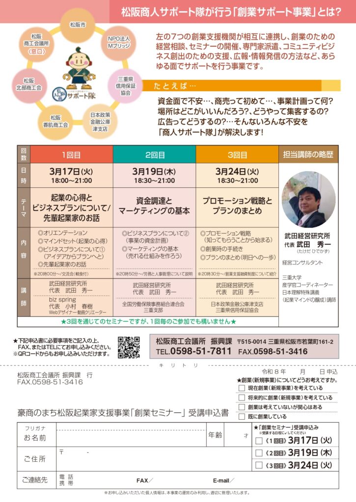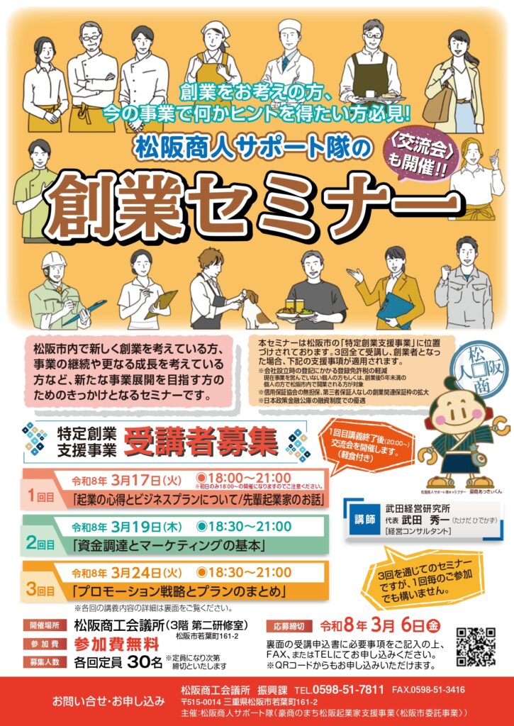 2026年1月15日 / 最終更新日 : 2026年1月15日 okayama ご案内 創業セミナーのご案内 松阪市内で創業を考えている方、現在の事業の継続や更なる成長を考えている方を対象に、 新たな事業展開を目指すためのきっかけとなるセミナーを開催します。 申込はコチラから